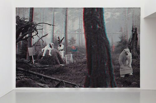 In Make Tofu Not War (2018), a digitally printed tapestry that can be viewed through 3D glasses, she depicts a mysterious group of figures in animal costumes deep in a forest. Ambiguous details such as the Tower of Babel, an astronaut and space capsule, and protest banners alluding to George Orwell and contemporary climate protests, create an unsettling blend of past, present, and possible future.