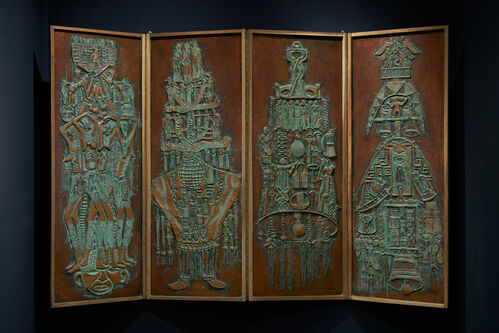 One of the most prominent figures of Nigerian modernism and a founding member of the influential Zaria Art Society, Bruce Onobrakpeya is represented in TAFETA’s booth with a stunning patinated four-panel metal work, Emiovwo Beroma I; Ore Mu Vbo Gbo; Agogo and Tisha (1983).