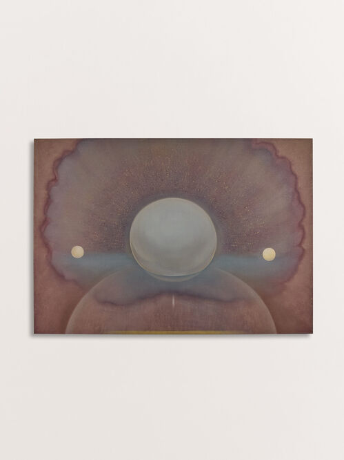 Many of these works feature an ovoid shape. In Reclaim XII (2025), for instance, a soft blue egg is cradled by a gray landscape, whereas Savouring Silence II (2022) transforms the same shape into a portal through which the viewer can see a distant, hazy landscape. Meanwhile, Eternal State of Mind (2024) features a pearl-like shape, framed by a scallop shell halo, evoking Sandro Botticelli’s The Birth of Venus (ca. 1486). For Ghil, each work embodies a personal emotional quality. “I really want to visualise how I feel about myself inside—hence why my work is like an inner self portrait,” she said in an interview.