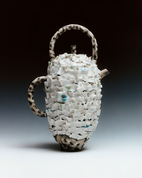 The selection of artists in the show also use less conventional materials to adorn their ceramic and porcelain teapots. For instance, Lebanese American artist Simone Fattal and Japanese sculptor Shozo Michikawa both create woven leather handles for their contributions. Meanwhile British designer David Chipperfield presents a glazed cobalt teapot, complete with a copper handle.