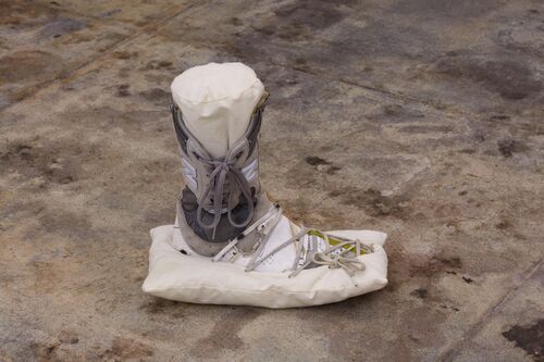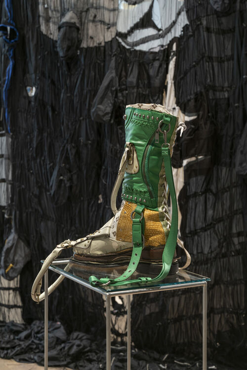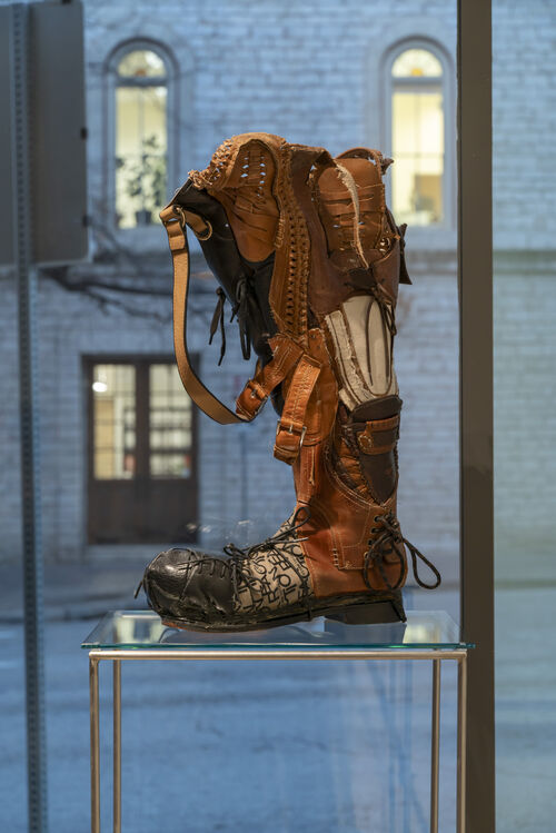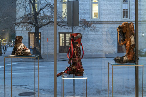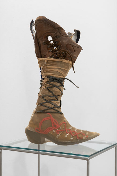 Her current Ehrlich Steinberg show “Science and Worms” merges the contradictions in “fashion time” and “museum time,” abstracting institutional methods of conservation and applying them to shoes that already appear to be falling apart. In her research, Schimmel was surprised to learn “how much effort is put into the preservation of materials that are not meant to be preserved,” she said, as well as some conservators’ desire to maintain the exact point of an object’s existing decomposition. Among her new “Receptacles” sculptures of deconstructed shoes, some are fused at the sole to strange cushions inspired by those in the MFA Boston’s costume archives. Others, fittingly, are held together inside transparent “tombs” of plastic and rubber sleeves. The title refers to Baudrillard’s idea that, in taking cultural artifacts out of their organic context, museum preservation is its own type of unnatural death.