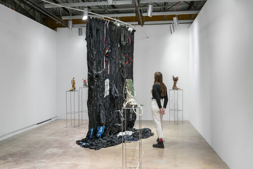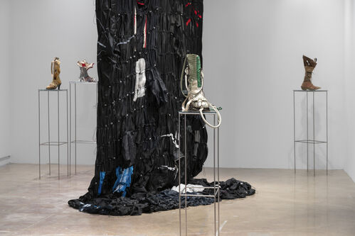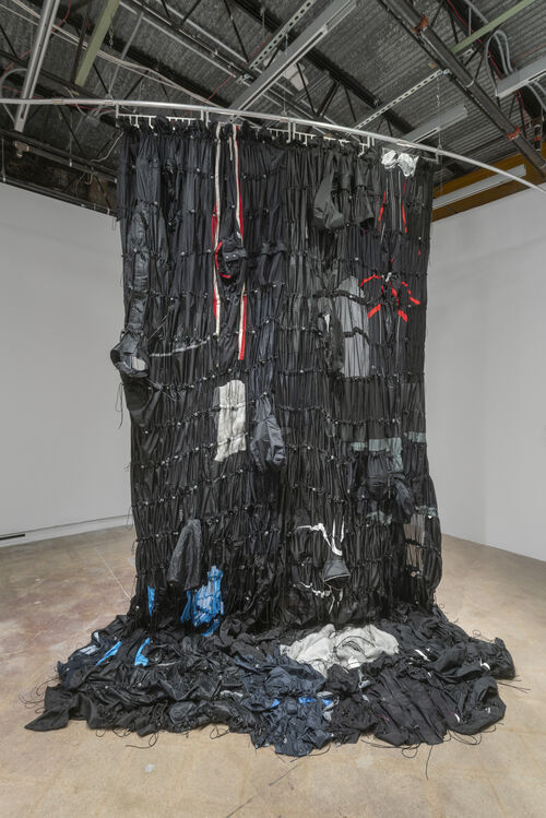 The resulting works, on view now at her two concurrent, debut U.S. solo shows, offer a critique of industrial overconsumption and waste. Some pieces are deconstructed into total abstractions, while others remain legible as clothing—albeit freakishly altered and radically reimagined.