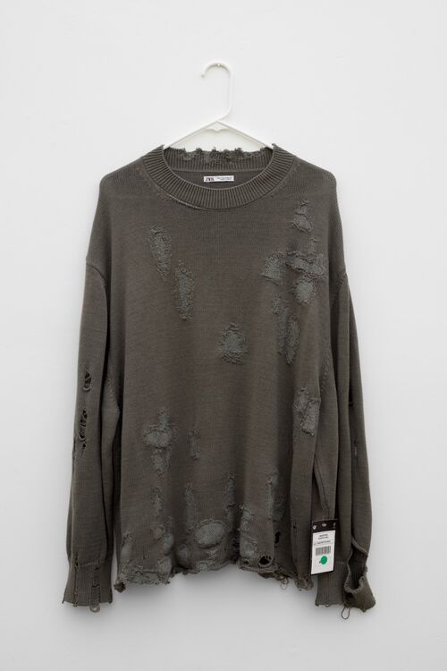In her conceptual practice, Tenant of Culture is about extending fashion’s notoriously short life cycle, recycling its essentially worthless debris into rigorously constructed sculpture. At “Host: Tenant of Culture” at The Contemporary Austin (on view through August 3rd), Puzzlecut Boot Brown (2021) is a single Frankenstein heel, sutured with purse straps and belt buckles and stacked from the soles of other shoes. “Science and Worms” at Ehrlich Steinberg in Los Angeles (on view through April 5th) features a newer suite of similarly de- and reconstructed footwear, as well as Sabotage in Acrylic (series nr 3) (2025), a piece made from a synthetic Zara sweater that once featured trendy, machine-made holes. Schimmel laboriously repaired them by hand to highlight the difference between “industrial time” versus “craft time”: “Something that was produced in probably less than half an hour took months and months to restore.” Found secondhand with its tag intact, the sweater also embodied fast fashion’s increasingly rapid cycle of replacement; it had been discarded before it was ever worn.