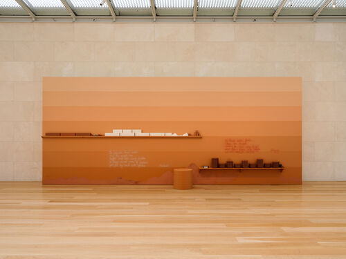At the Nasher, Nkanga introduces two new soaps, one white, one red—08 Salt Rock and 08 Red Bond. Created in collaboration with local Texan soapmakers, the bars are made from red clay, vanilla honey, salt, pumice, and poppy seeds. Each with separate recipes, the soaps convey meaning through their contents: 08 Salt Rock evokes ocean currents and trade routes; while 08 Red Bond, with its use of local soil, connects to the earth and is meant to draw out toxins and trace buried histories.