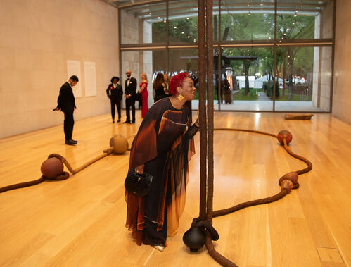 The Nasher show was made almost entirely on site and continues her place-based approach. “Otobong’s whole approach here is grounded in place—working with local artisans, exploring the soil, herbs, and materials of North Texas, and anchoring everything in sensory memory and shared experience,” Morse noted.