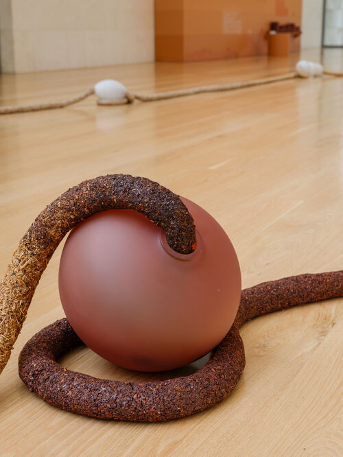 Each Seed a Body—also the title of the exhibition—is certainly memorable. The long, snakelike, sculptural installation (more than 53 feet in length) is made from a hemp rope encrusted in herbs and foodstuffs that are either native to Texas or have become naturalized over time. The fluid form loops through the light-filled gallery, climbs to the ceiling and back down to the floor, and threads through blown-glass vessels like a very large beaded necklace. The combination of materials evokes stories of migration and generations of locals who have given to, and taken from, the land.