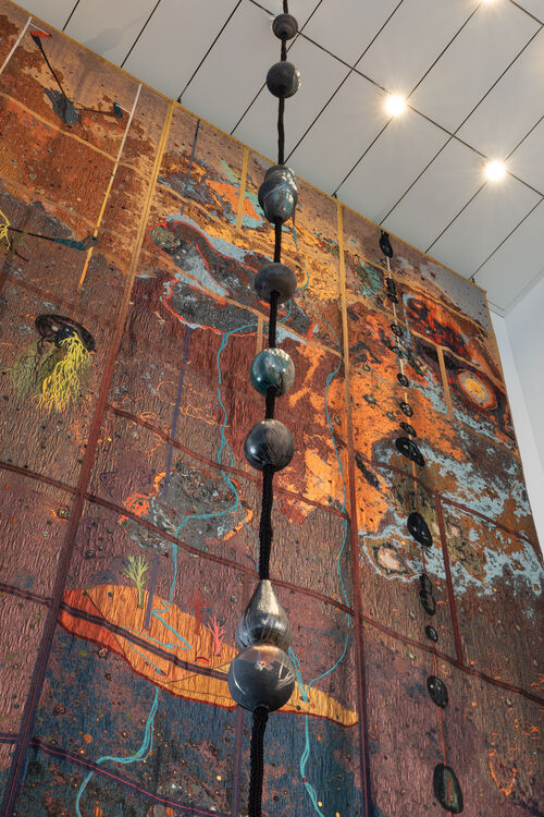 These shared histories and global concerns are at the heart of Nkanga’s work. At the Museum of Modern Art in New York, her current installation, Cadence (2024), uses tapestry, sound, and sculpture to explore grief and environmental disruption. And last summer at Lisson Gallery in London, she showed scorched ceramic towers, fiber works, and bowls of seeds, evoking a landscape of destruction and healing.
