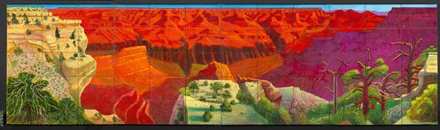 The work is a celebration of the epic scale of American landscape and employs a more pigmented, bold palette than he used in his previous works, a new style he developed in the mid to late ’90s as he spent time back in Yorkshire following the death of his dear friend, American sculptor Jonathan Silver.