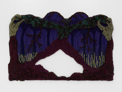 Wielding a tufting gun, Sam Druant intricately stitches wool threads into fantastical tapestries, creating mythological scenes in an experimental take on traditional rug-making. For instance, in her wall work Daphne (all works 2025), Druant leaves an empty space where viewers can see the wall beneath. The work’s title references the mythological nymph who was turned into a laurel tree by the god Apollo, and the tree’s anthropomorphic shape seems to hint at this story. Yet, it’s the empty space that acts as the focal point, drawing viewers into the tapestry. This work is part of Druant’s current solo show, “Hatching Between Two Trees,” at de boer in Antwerp.