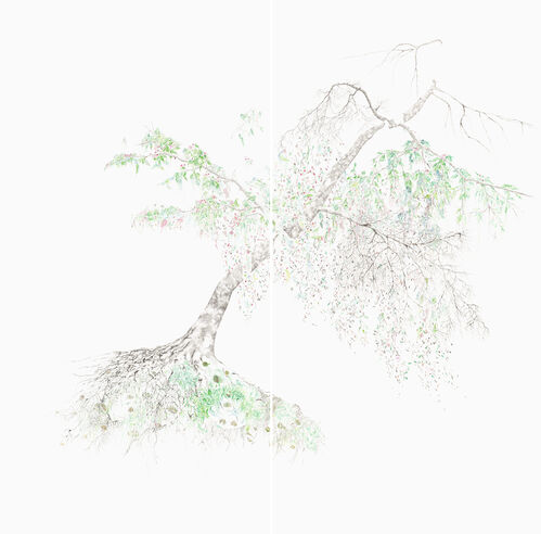 The gallery space is filled with a selection of Oberkofler’s ink and watercolor works on paper, capturing an array of natural forms such as trees, flowers, birds, and salamanders. One standout piece, a large-format, two-part drawing, Vibrations (2024), portrays a fruit tree that is simultaneously decaying and blooming. In this work, Oberkofler explores the cycles of life and death, detailing these processes with fine, dotted ink marks that evoke the fragility of natural patterns and the world we live in.