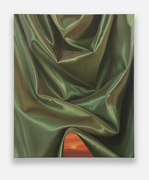 In Metallic Teal Green Fabric with Landscape (after Bierstadt) (2025), Huckins purposefully obstructs a luminous mountainscape with an imposing emerald green curtain painted to appear draped across the canvas, revealing only the peak of the mountain. Similarly, Green Satin Fabric with Sunset (2024) depicts a draped fabric with a small, rounded opening at the bottom that reveals a fiery orange-red glow. In focusing the viewer’s attention on these climactic views of nature, Huckins seems to comment on what might be missed—the messier or less photogenic moments—all hidden beneath the lush material of his statement canvases.