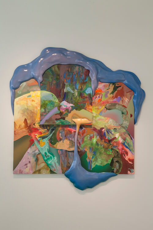 Many of Siiri Jüris’s paintings are bordered by wooden frames shaped and colored to resemble a goo-like substance. These amorphous frames create the illusion that the kaleidoscopic color fields are seeping from her canvases. For instance, you, close to my heart (2025) features one massive canvas with a smaller affixed canvas, each crowned with this distinctive frame. The panels are bursting with swirling color painted across both canvases with energetic brushstrokes. This 3D painting is part of Jüris’s solo show, “to melt into your soil and sprout as a flower,” at Tütar Gallery in Tallinn, Estonia.
