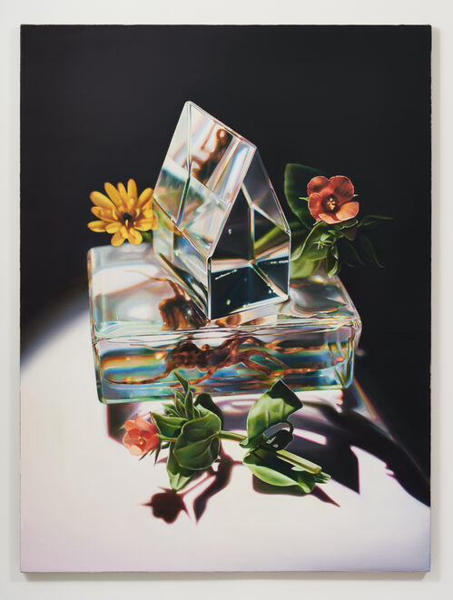 Satlowski has earned attention for her seductive photorealistic paintings that feature uncanny still lifes and object studies. Drawing from a range of visual references including Catholic iconography, Dutch still life, Rococo ornamentation, body horror, and commercial photography, she often works from collections of found objects. These items—organic and man-made—are gathered during her travels or daily life. Her paintings feature ambiguous arrangements of flowers, spiders, dolls, perfume bottles, and plastic trinkets, rendered in high detail with compositions that evoke both personal and collective memory.