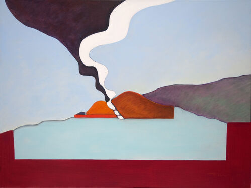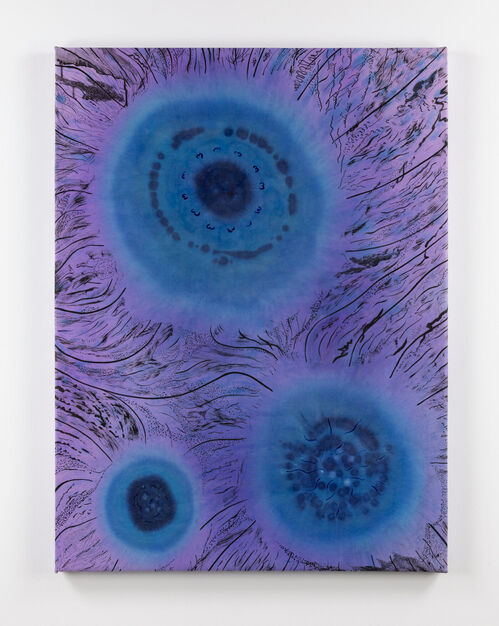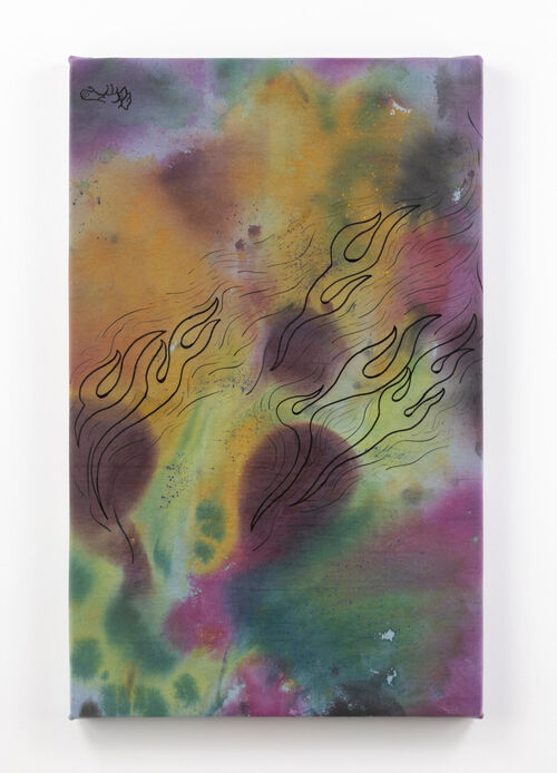 In tender, blooming paintings, emerging Chinese artist Yunfei Ren explores global migration and its impact on people over time. The New York–based artist presents billowing color field paintings, reminiscent of tie-dye blotches. He adds fluid ink marks to his canvases in a process intended to capture the natural phenomena seen by migrants on their journeys. In Scorched Into Memory (2025), for instance, moody purples and yellows create an emotional backdrop for flame shapes that echo across the canvas. The work gestures, perhaps, to the warmth of a burning hearth or the danger of a raging wildfire.