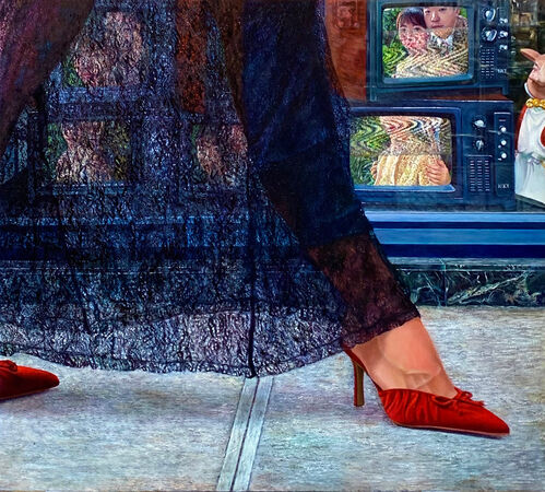 Inspired by a personal encounter with an infinity mirror in a dressing room, Ellie Kayu Ng’s latest works render the city and herself with hyperreal precision. These scenes, on second look, dissolve into dreamlike spaces. Fitting Room Visions (2025), for instance, features a woman wearing a purple dress who is multiplied in mirrors. Hands on hips, she appears like a ballerina on stage—but hidden away in a curtained, behind-the-scenes spot. Elsewhere, city streets and nighttime interiors become settings to explore shifting identity through fashion-inflected imagery. A gauzy patterned scarf encircles a subject’s face in Nighthawk (2024), and chic pointed red shoes strut the street in My Fair Lady (2025). On view now at Latitude Gallery New York, Ng’s “Bloom!” features 11 new paintings that explore identity as something fluid, continually refracted through the act of performance.