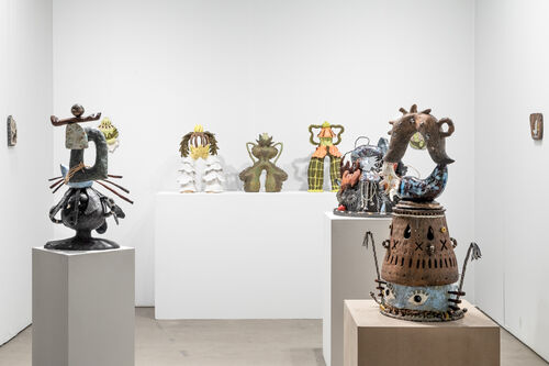 Other galleries are approaching EXPO with a slower, more meditative rhythm. Los Angeles’s Megan Mulrooney, also making its debut at this year’s fair, is presenting a two-person ceramics booth from Maddy Inez and Josh Cloud, rooted in themes of healing. Inez—the granddaughter of Betye Saar and daughter of Alison Saar—presented glazed ceramic works inspired by the matilija flower, a species of poppy that only germinates in the presence of smoke. Created in response to the California wildfires, her compositions reflected the idea of beauty emerging from devastation. Cloud’s works—ceramic structures that appear to be collaged together—reflect on queerness and identity, complementing the emotional register of the booth.