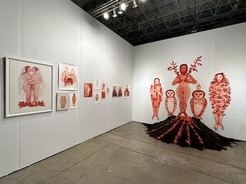 This preference for emotionally resonant work carried over to San Francisco–based re.riddle, which made its EXPO debut with a presentation by Paris-based Mongolian artist Odonchimeg Davaadorj. With prices ranging from $800 to just over $6,000, the booth included red watercolor works on paper and a commanding installation: five large-scale, red-toned figurative cutouts depicting a nude woman, flanked by two owls and two shorter figures, set above a mound of red-streaked dirt. The result was raw, symbolic, and a refreshing approach to a booth presentation.