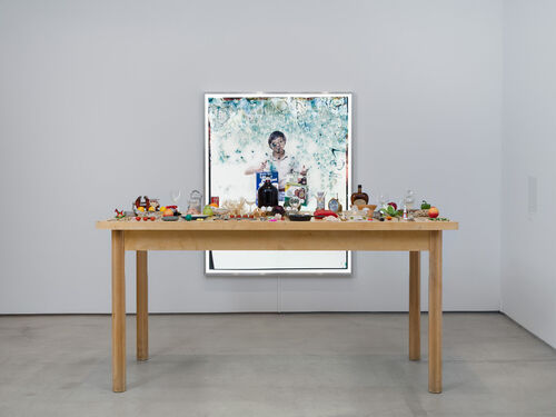 The appetite for experimentation from galleries across the fair found its sharpest edge at Portland-based ILY2’s booth. The presentation was anchored by Amanda Ross Ho’s Untitled Prop Archive (THE PORTFOLIO) (2024): a sculpture composed of dozens of objects inspired by items—from licence plates to lemons—found in the photo archive of her father, Ruyell Ho. These items were arranged on an enlarged replica of the wooden table from her childhood home, standing in front of a water-damaged portrait of Ruyell.