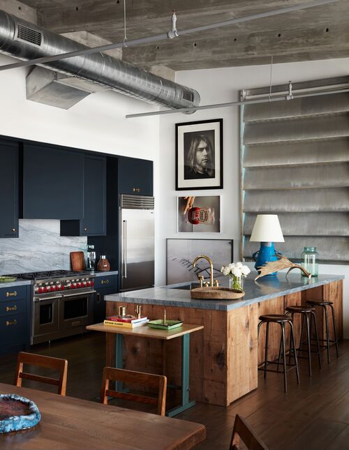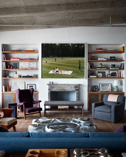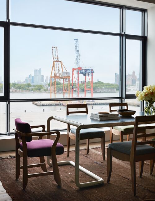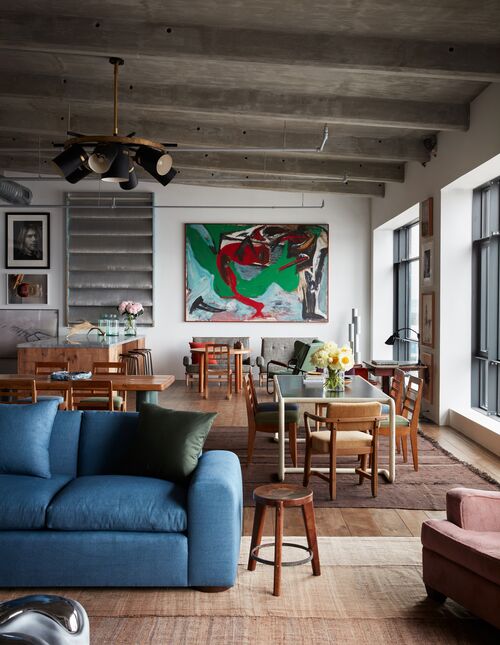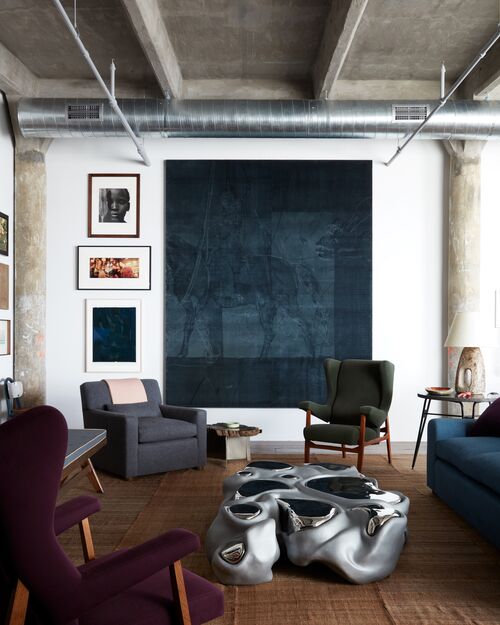 It wasn’t difficult for Stilin to flip this approach on himself with the Red Hook apartment. When he purchased the space, it was a blank canvas—or, in other words, an interior designer’s dream. Working with the architect Mark Gettys, Stilin installed a spacious bathroom, a master suite, and a guest room. Other parts were added with the original loft spirit in mind: open, communal, and flexible. The kitchen, dining, and living areas flow into one another, connected by a rhythm of artworks and furniture spanning decades and styles. A Campana Brothers chair sits in the bedroom. A sculptural Misha Kahn table anchors the living room.