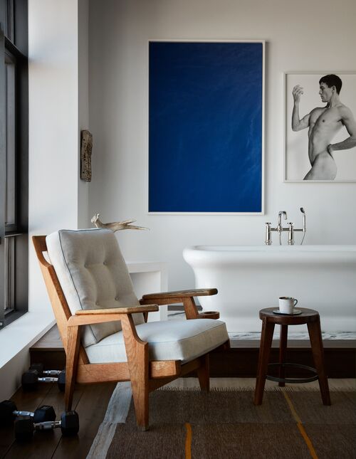 This playfulness—of the choice of art and how it is displayed—is reflected in every corner of Stilin’s house. Each room is filled with art that has caught his eye. In front of his kitchen island, the wall features Martin Disler’s massive, frenetic painting Preparing for Tonight (1982), while in the kitchen is a series of photographs, including a portrait of Kurt Cobain by Seliger. Even his bathroom houses some of the collector’s most notable photographs. Above his Waterworks bathtub and Rick Owens stool are Jack Pierson’s Sic Vita (2016), an ocean blue abstract photo, and Lucian (2023), a portrait of a nude male figure.