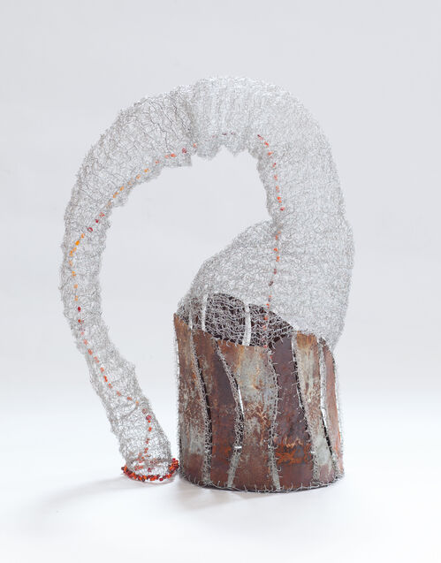 A trip to Mexico at 21 introduced Asawa to basket weaving—an experience that transformed her artistic practice. Kenyan artist Naomi Wanjiku Gakunga, however, learned the craft from watching her grandmother fashion baskets from fibers native to their village. Today, Gakunga blends traditional materials like the rope her grandmother spun from migiyo shrubs with unexpected elements like steel wire and mabati, a galvanized sheet metal used for roofing. Her metallic, crocheted wall-hangings emulate the pliancy and airy lightness most often attributed to textiles. While some recall tapestries and gossamer curtains, others seem to fall like lace or float like the hem of a dancer’s skirt. In her basket-inspired series, Gakunga interlaces wire with patterned fabrics and brilliant yarns to create amorphous vessels with striking, contemporary proportions.