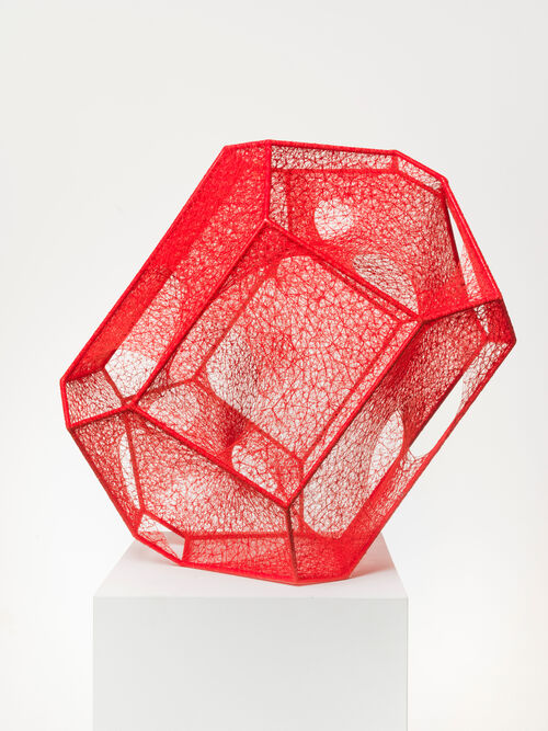 Instead of renouncing the feminine connotations traditionally assigned to craft techniques, Marcy Chevali embraces the textile practices once dismissed as “women’s work.” By applying processes borrowed from knitting and weaving to lampworking and wire-tying, she creates enthralling, biomorphic-shaped nets that are freestanding or suspended from the ceiling. These illusory glass and wire grids reinterpret delicacy as complexity and fragility as strength. Chevali, like Asawa, is interested in permeability and creating boundaries that visually expand and contract. While her webs define and demarcate space, they don’t obstruct it, making it possible to see through them from every angle. For both artists, freedom is a formal and political ideal.