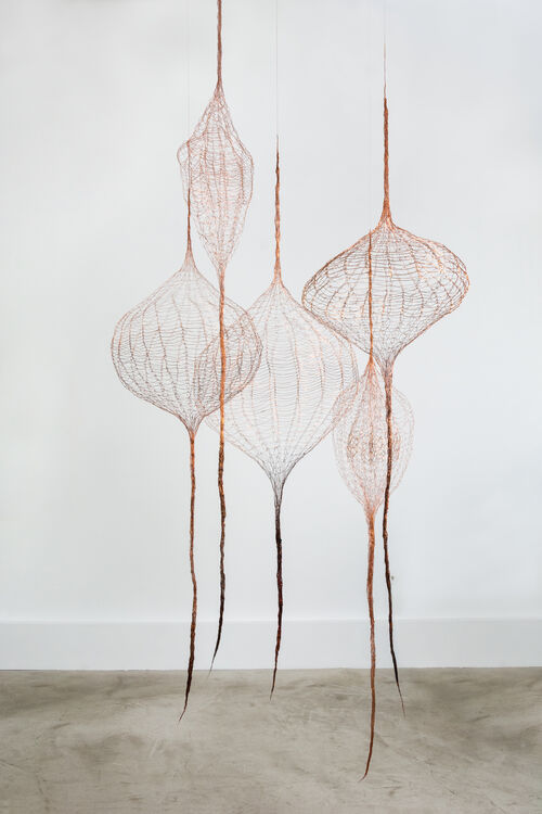 Inspired by her childhood on a tiny island on the northwest coast of Norway, Gjertrud Hals crafts sculptures that entwine the story of her hometown with the history of the world, braiding personal narratives with social mythologies. Hals’s formal training as a tapestry weaver is evidenced by her signature netted vessels and hanging sculptures that recall crochet lace, traditional basketry, and fishermen’s nets. After transitioning from textiles to fiber in the late 1980s, she began spinning and casting her signature forms from cotton and paper pulp. These womblike, volumetric shapes echo Asawa’s aesthetic vocabulary of transparency and negative space, suggesting a similar ethereal weightlessness.